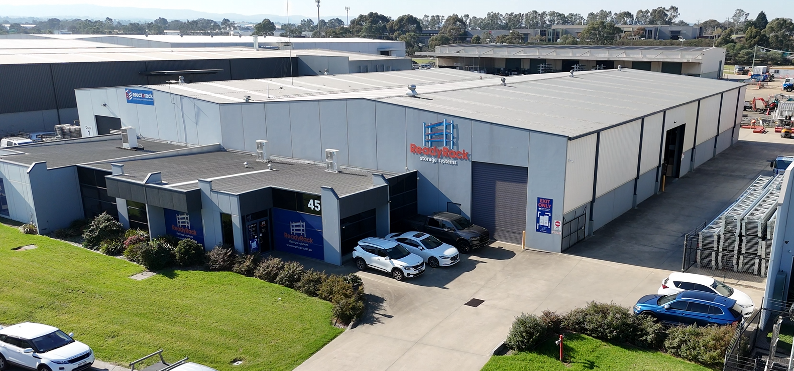 ReadyRack warehouse with 'Australia Wide Shipping' logo on a clear blue sky background