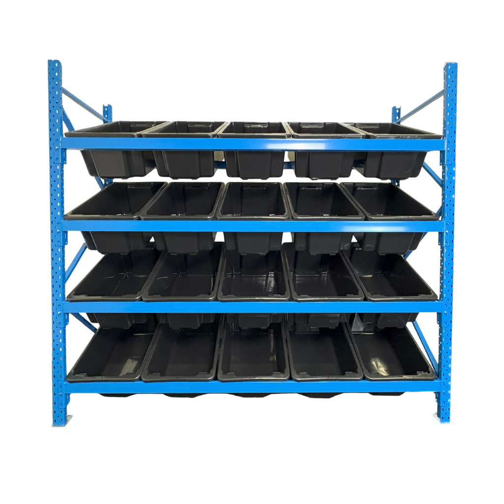 Single Bay: 2 x frames assembled, 8 x beams, 16 x 52 Litre Stack and Nest Crates and all hardware for assembly